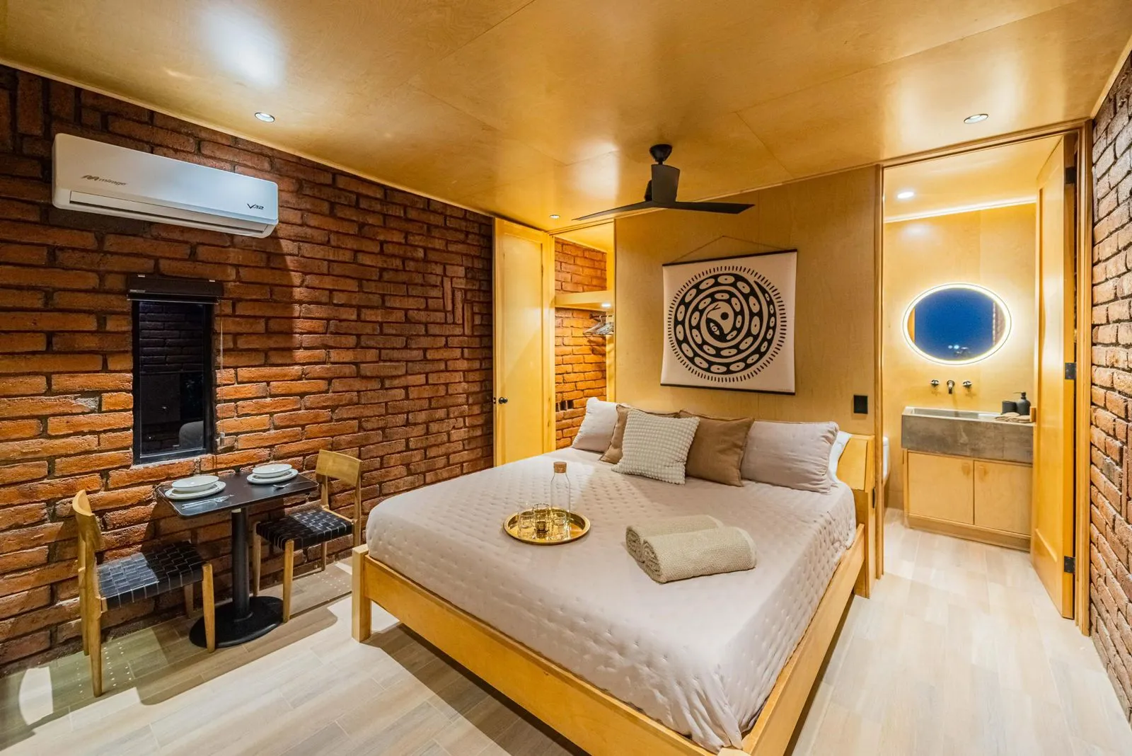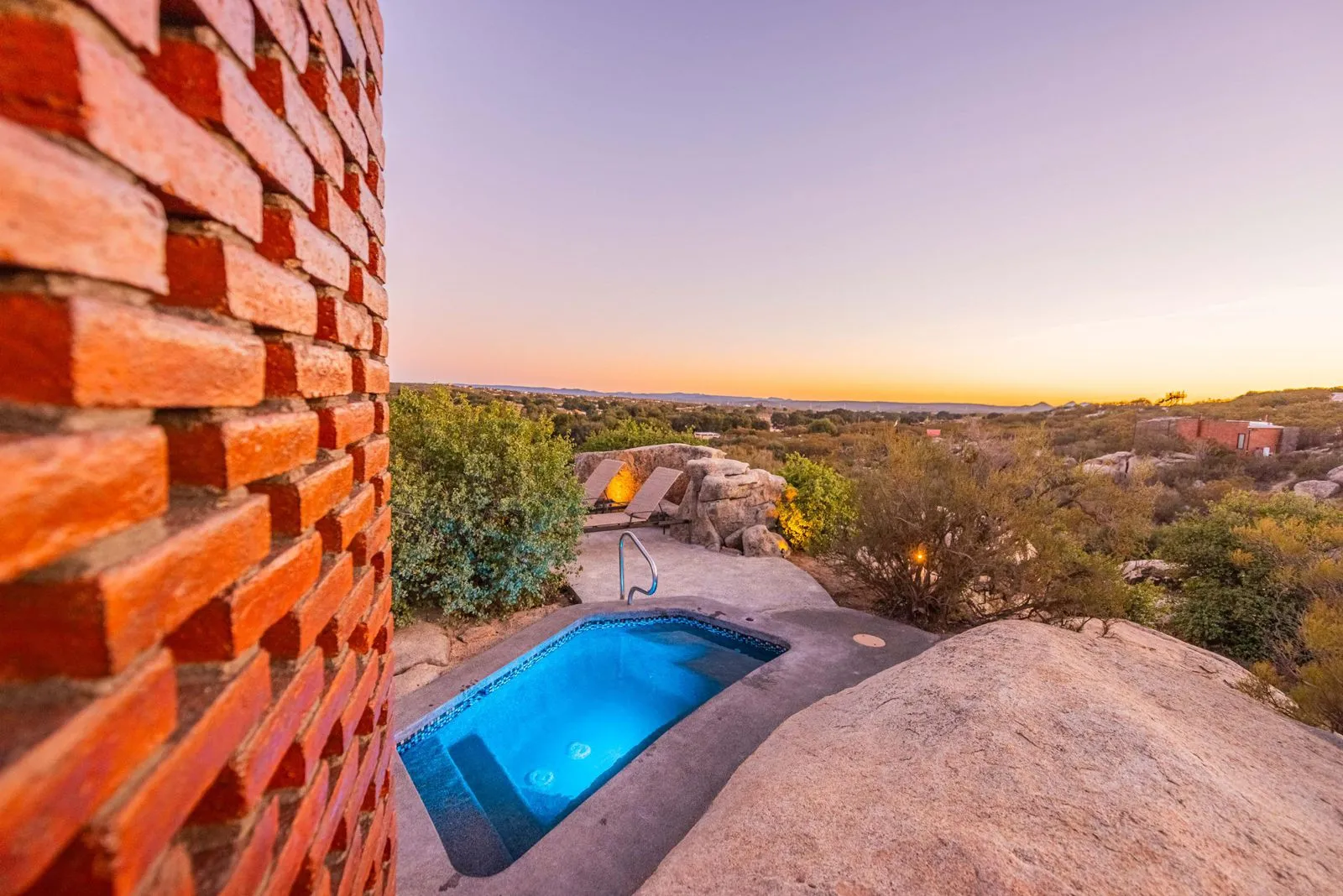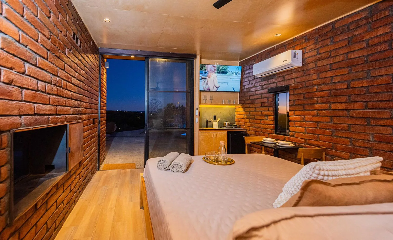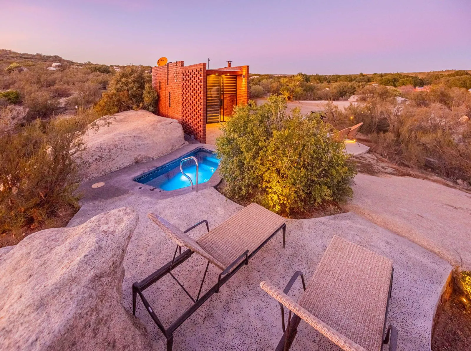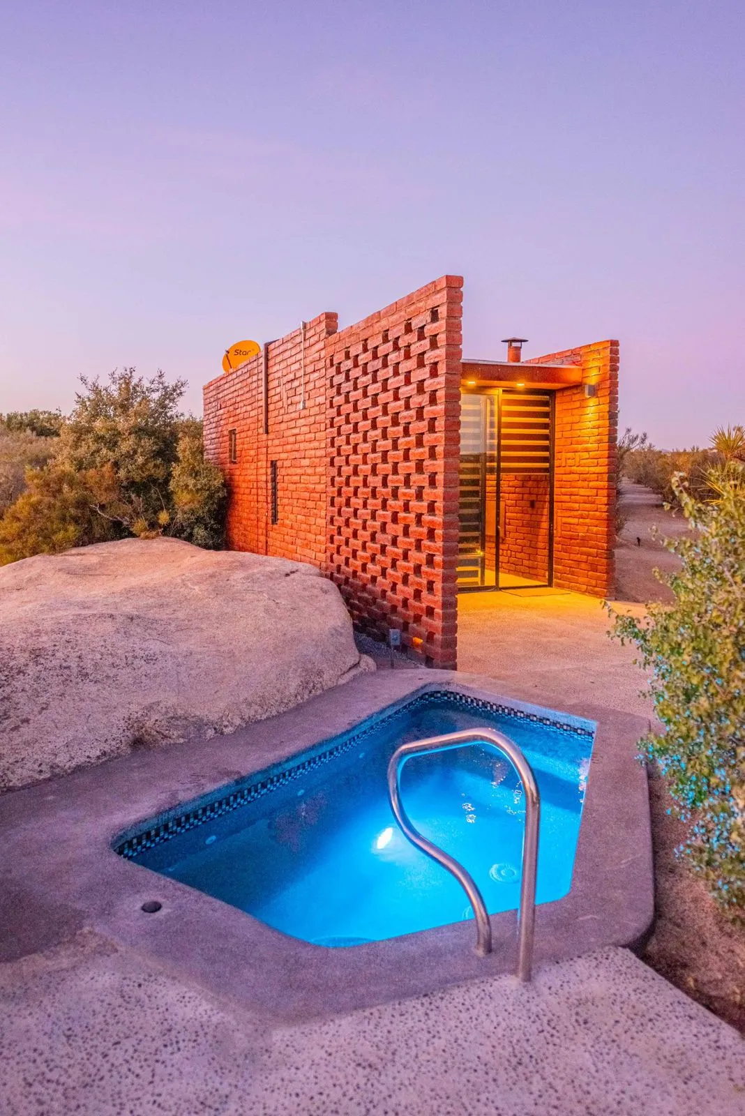 Está equipada con cama queen, cama twin, ventilador, calentón, baño completo con agua caliente, estufa de dos hornillas, refrigerador, lavaplatos y utensilios para cocinar. Tiene aire acondicionado, WiFi satelital, televisión y dish network. En el exterior cuenta con alberca privada climatizada, dos camastros, asador, hoguera y banca.