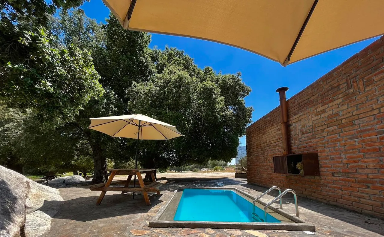 Está equipada con cama queen, cama twin, ventilador, mesita con dos sillas, calentón, baño completo con agua caliente, estufa de dos hornillas, refrigerador, lavaplatos y utensilios para cocinar. Tiene aire acondicionado, WiFi satelital, televisión y dish network. En el exterior cuenta con alberca privada climatizada, dos sombrillas, dos camastros, asador, hoguera y banca.
