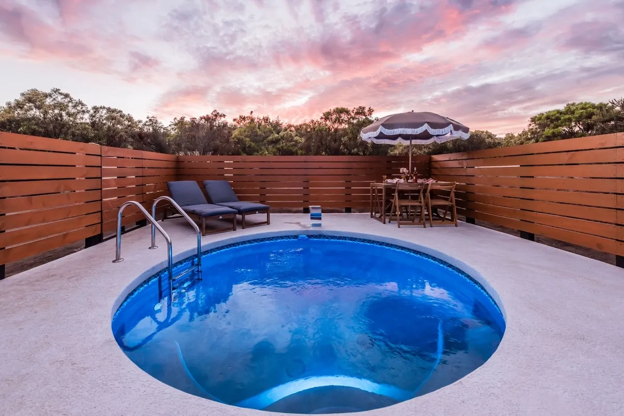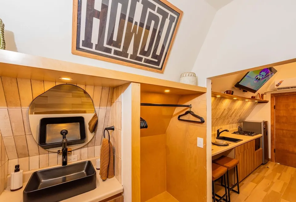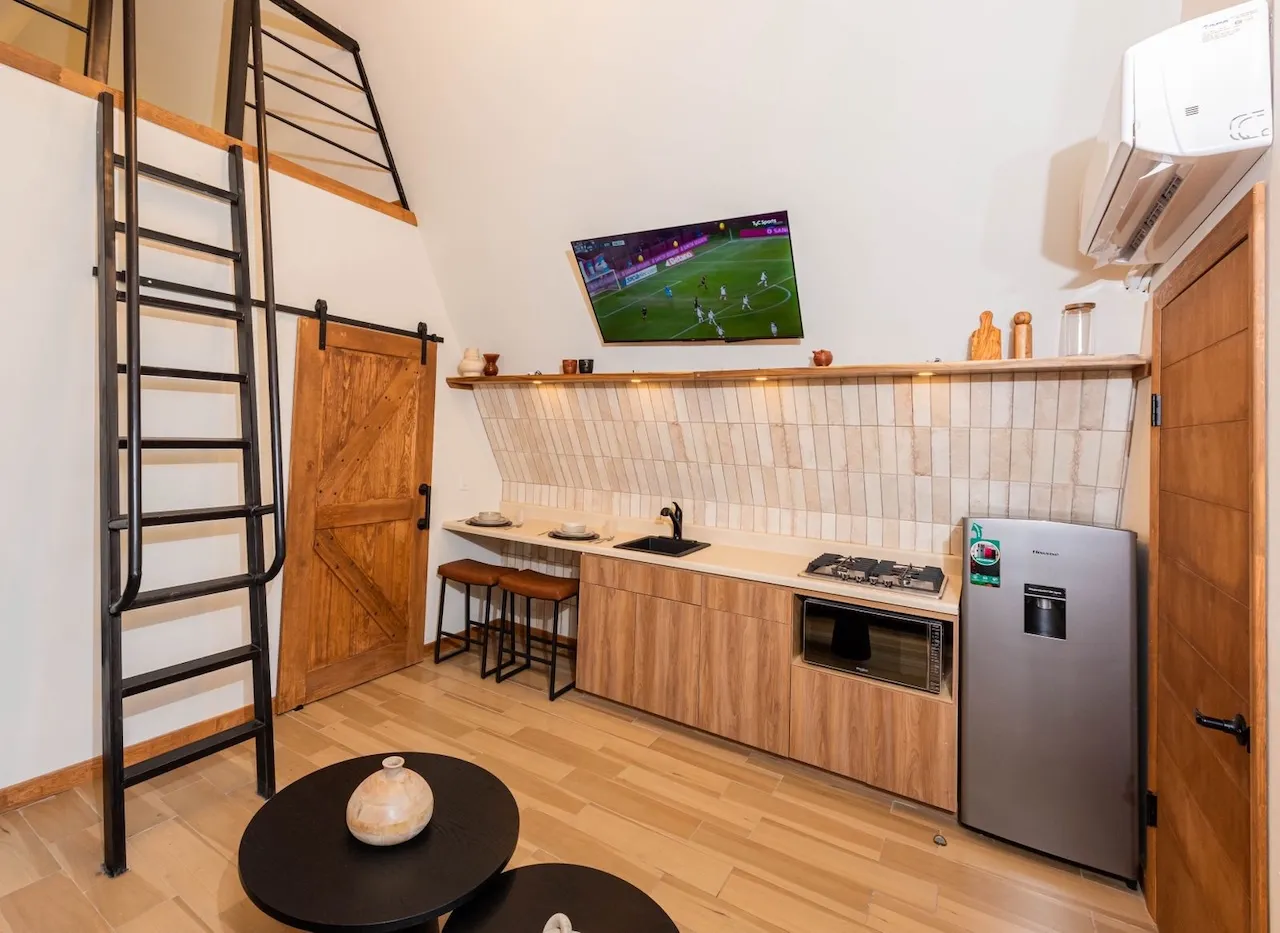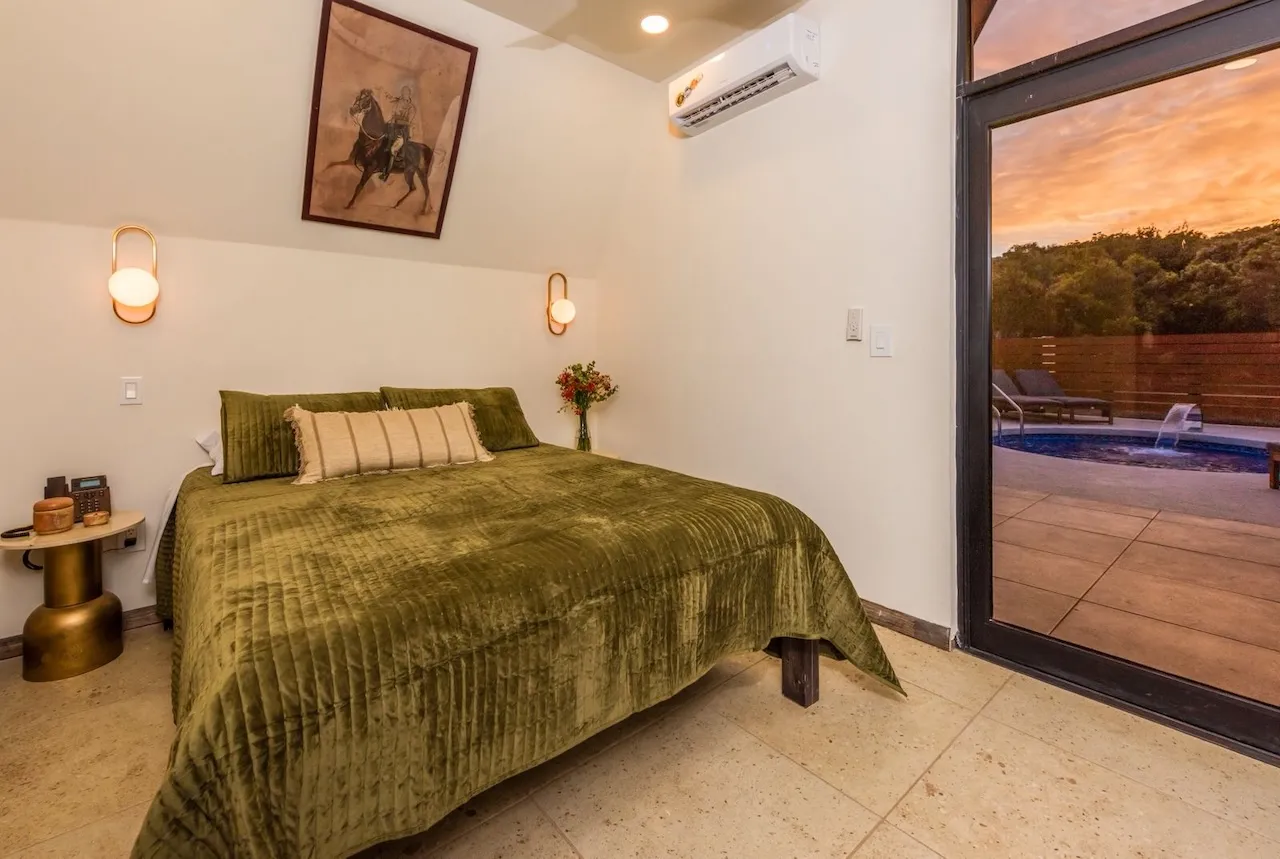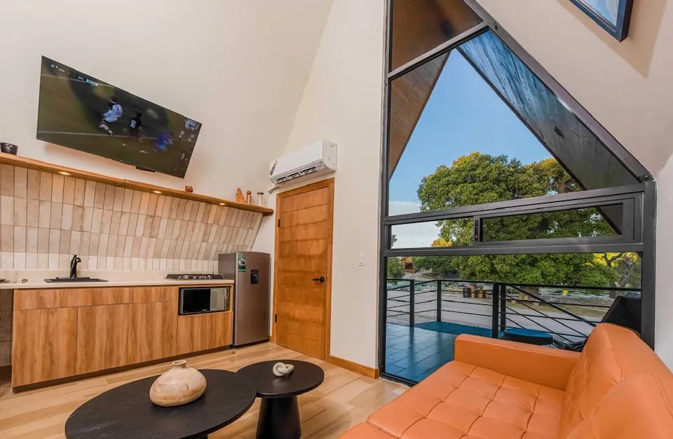 Está equipada con recámara con cama queen, sala con sofá cama, tapanco con cuatro colchonetas individuales, barrita con dos bancos, chimenea, baño completo con agua caliente, estufa de cuatro hornillas, horno de microondas, refrigerador y lavaplatos. Tiene aire acondicionado, WiFi satelital, dos televisiones y dish network. En el exterior cuenta con alberca privada / jacuzzi, cuatro camastros, mesa, cuatro sillas, asador, hoguera y banca.