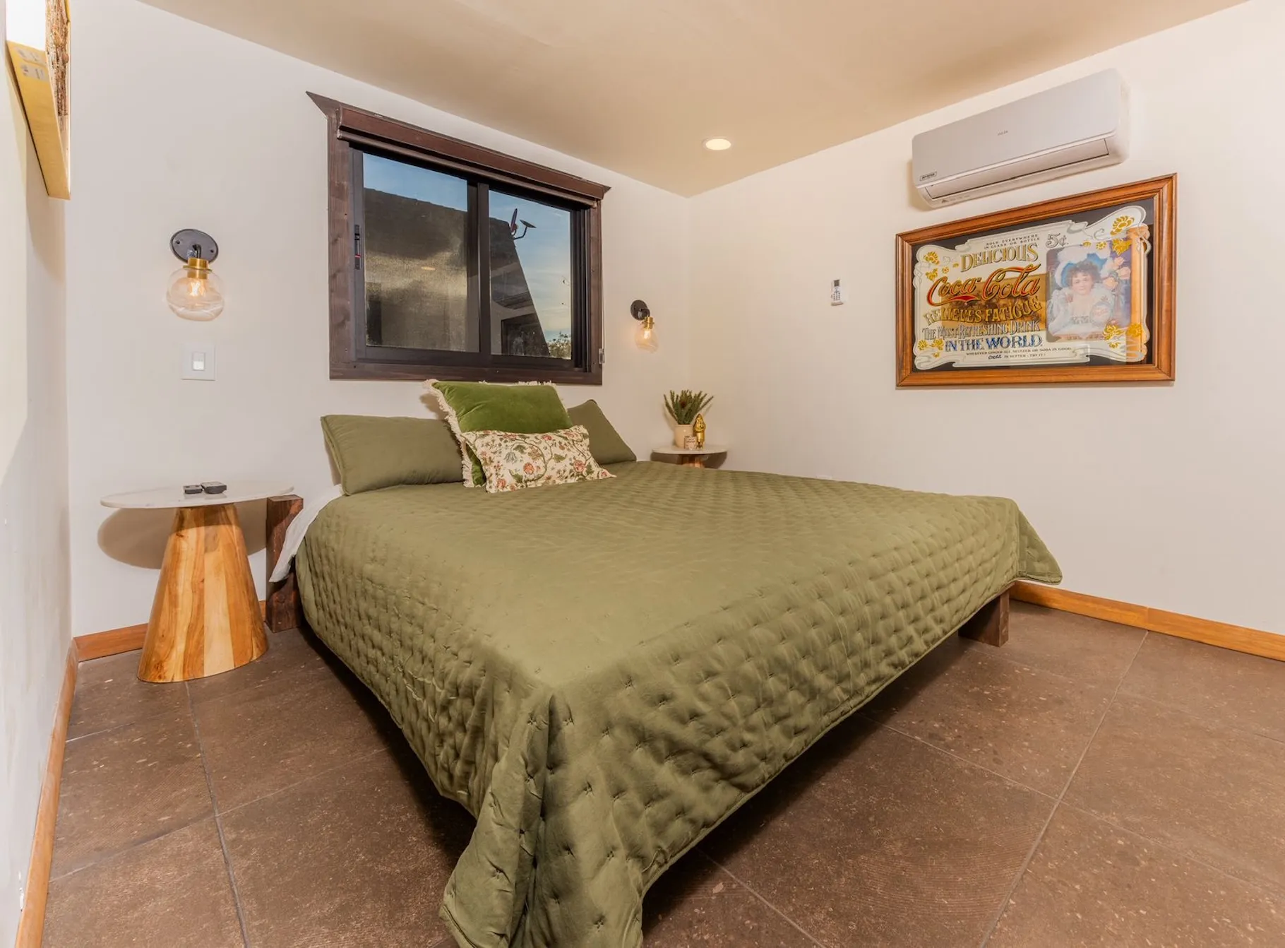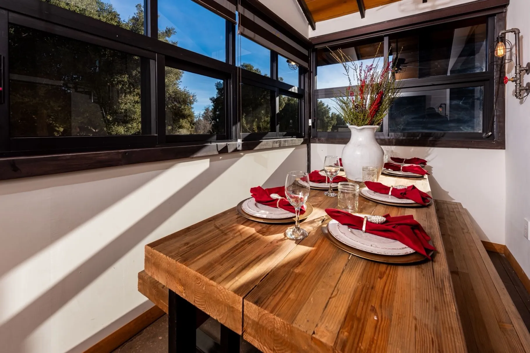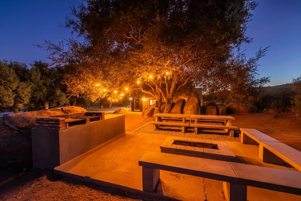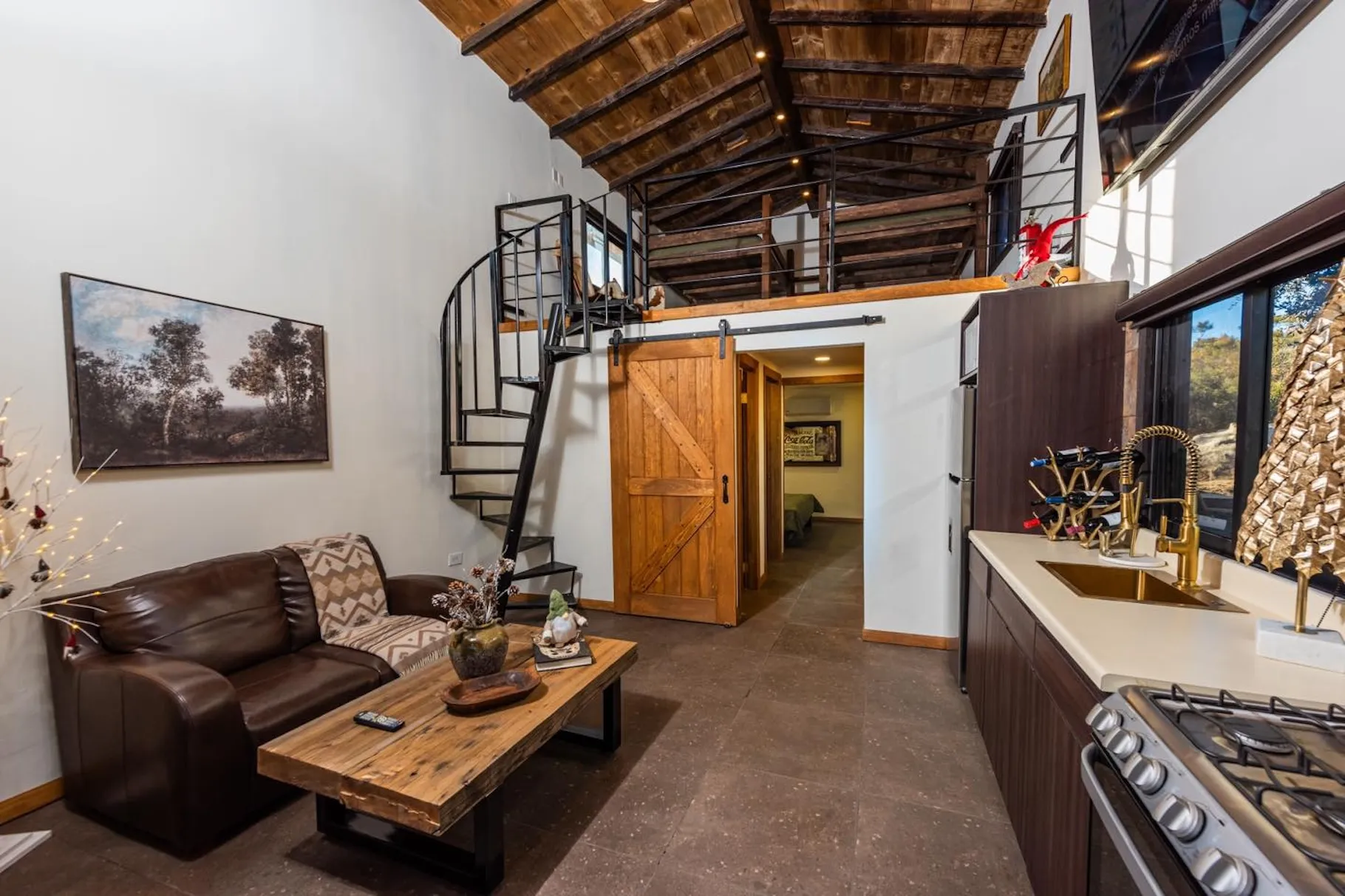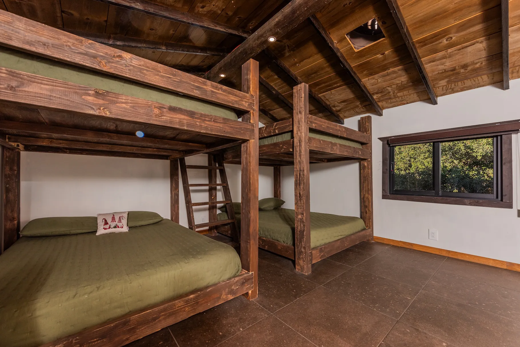 Está equipada con recámara con cama queen, chimenea, comedor, baño completo con agua caliente, sofá, estufa de seis hornillas, horno de microondas, refrigerador y lavaplatos. En el segundo piso tiene dos literas con colchones queen. Tiene aire acondicionado, WiFi satelital, dos televisiones y dish network. En el exterior cuenta con asador, hoguera y banca.