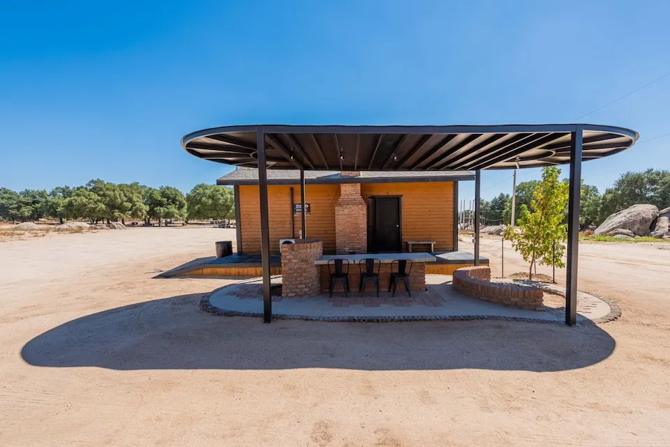 Está equipada con cama queen, litera con dos colchones queen, tapanco con colchoneta de vinil, domo con vista a las estrellas, barra con cuatro bancos, chimenea, baño completo con agua caliente, estufa de cuatro hornillas, refrigerador y lavaplatos. Tiene aire acondicionado, WiFi satelital, televisión y dish network. En el exterior cuenta con asador, hoguera y banca.