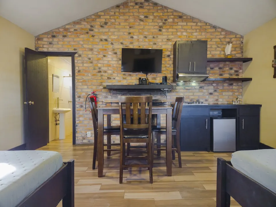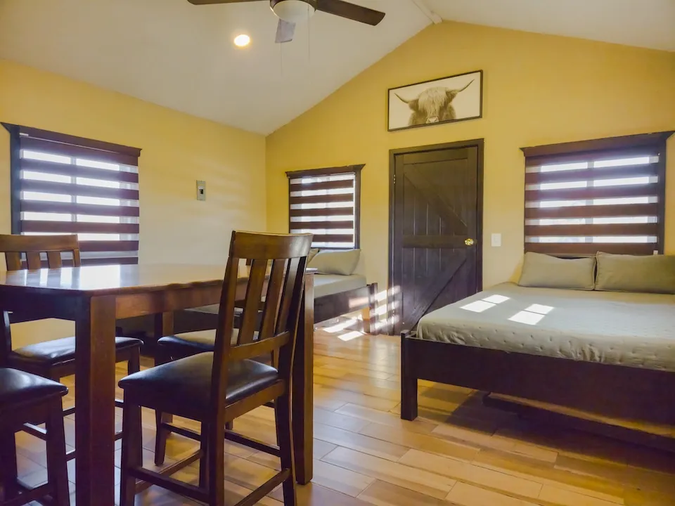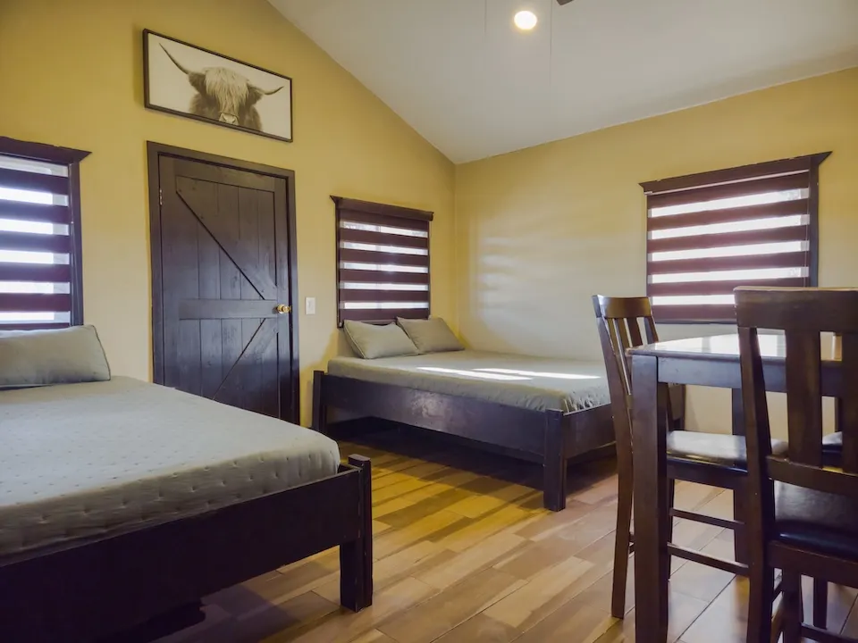 Está equipada con dos camas queen, dos camas twin, ventilador, chimenea, baño completo con agua caliente, estufa de cuatro hornillas, refrigerador y lavaplatos. Tiene WiFi satelital, televisión y dish network. En el exterior cuenta con asador, hoguera y banca.