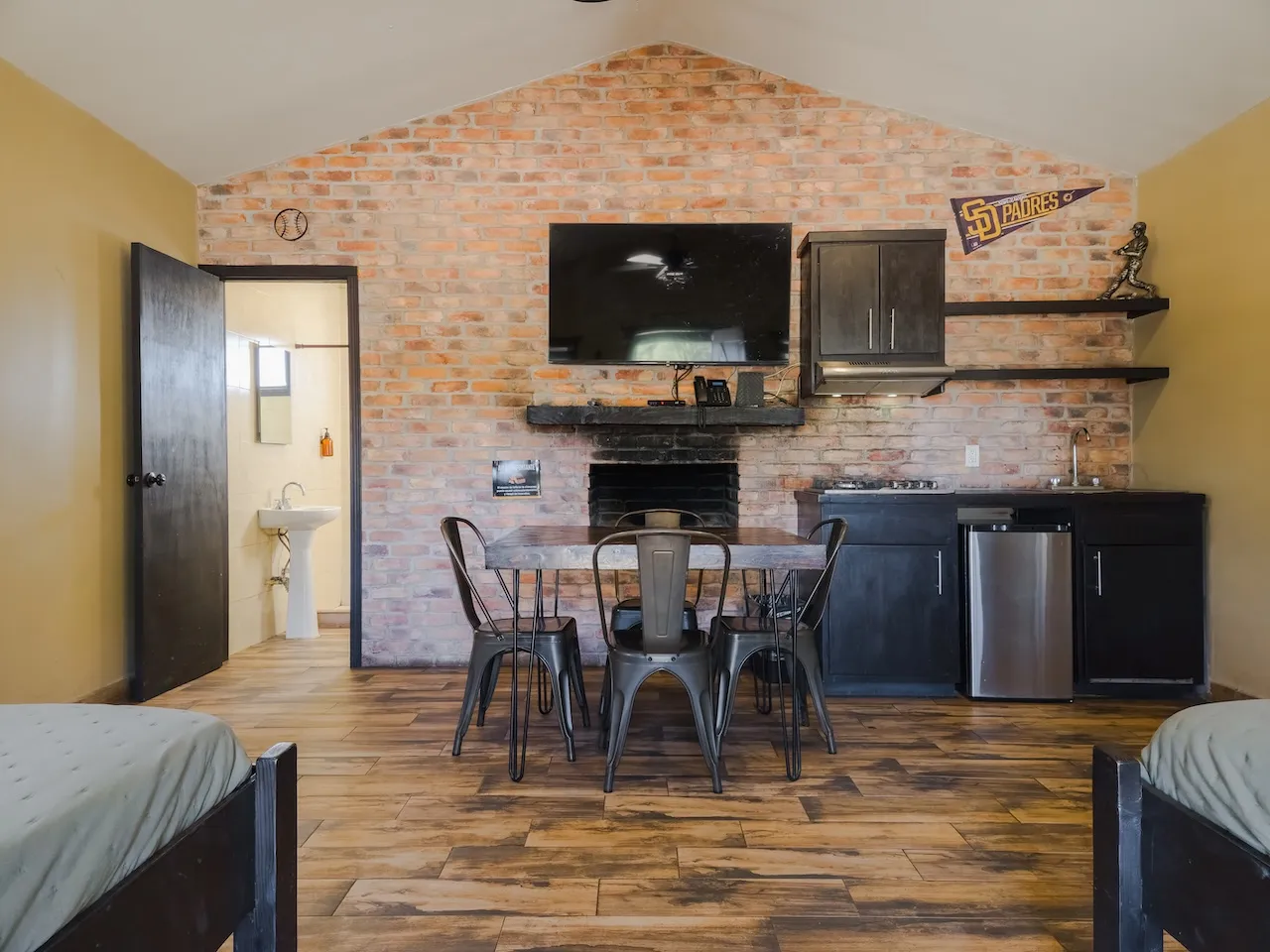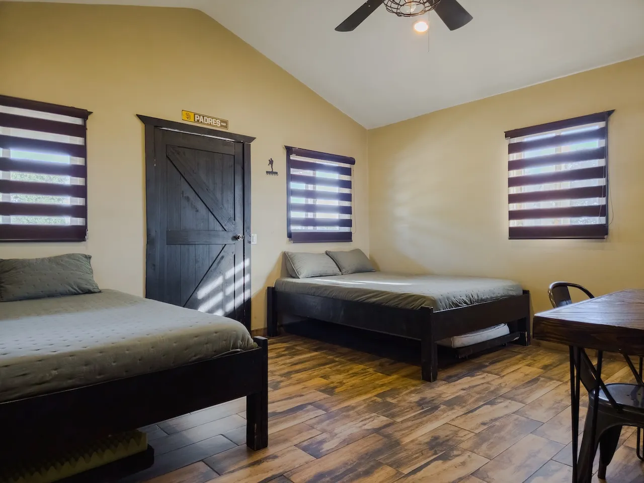 Está equipada con dos camas queen, dos camas twin, ventilador, chimenea, baño completo con agua caliente, estufa de cuatro hornillas, refrigerador y lavaplatos. Tiene WiFi satelital, televisión y dish network. En el exterior cuenta con asador, hoguera y banca.
